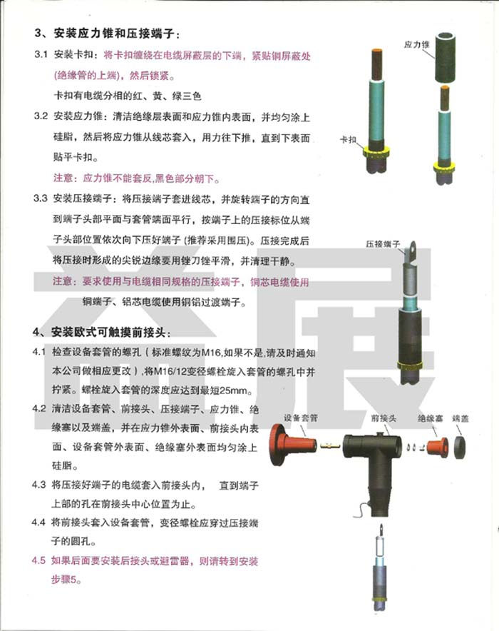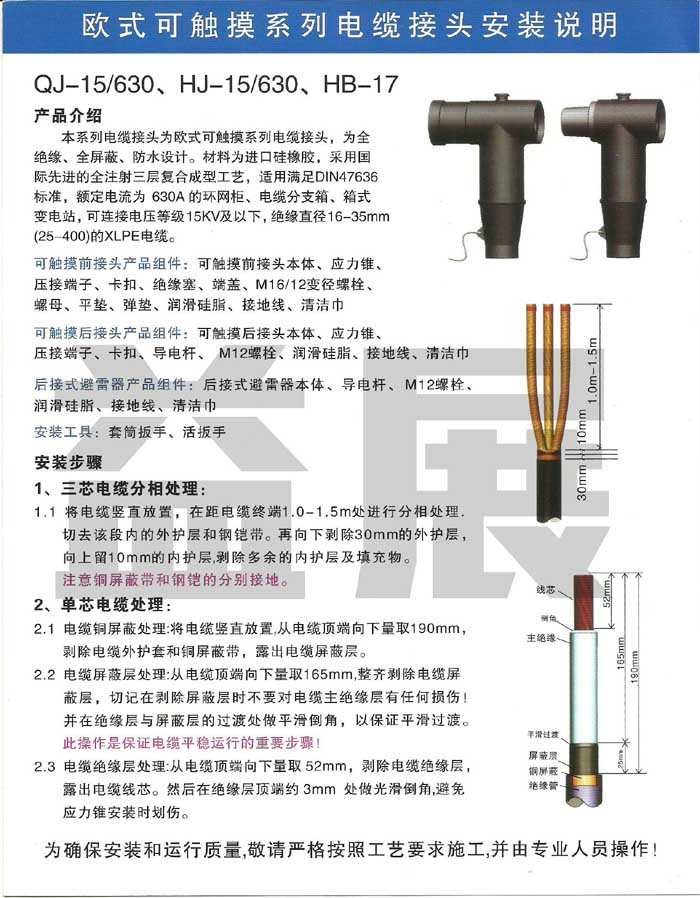 可觸摸歐式插拔頭產品特點:先進的后注射工藝,外層有起屏蔽作用的半導電層,可觸摸,確保人身安全。獨特的盈利在結構,有效地疏散電場應力,解決電纜屏蔽層切斷處電場應力問題。可擴展性,拆裝靈活。可完成電纜的T型連接,全密封,全絕緣,全防護,免維護,抗淹沒,抗污穢。